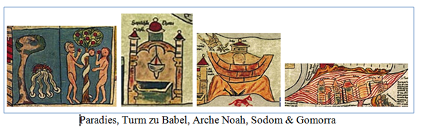 0 – Jerusalem. 1 – Das Paradies. 2 – Ganges und Gangesdelta. 3 – 4 – Indus und Tigris. 5 – Die Gegend des Kaspischen Meeres. 6 – Babylon und der Euphrat / Der Turmbau zu Babel. 7 – Der Persische Golf. 8 – Das Rote Meer (in Rot gemalt). 9 – Noahs Arche. 10 – Das Tote Meer mit den versunkenen Städten Sodom und Gomorrha, in das aus dem See Genezareth der Jordan fließt – darüber Lots Weib, sich umdrehend. 11 – Ägypten und der Nil. 12 – 13 – Darüber: Das Goldene Vlies. 14 – Konstantinopel; links daneben das Donaudelta. 15 – Das Ägäisches Meer / Troja. 16 – Oversized delta of the Nile with Alexandria’s Lighthouse. 17 – Ein Skiläufer in Skandinavien. 18 – Griechenland. 19 – Kreta (grob falsch verzeichnet) mit Labyrinth. 20 – Das Adriatische Meer; Italien mit Rom. 21 – Sizilien und Karthago. 22 – Schottland. 23 – England. 24 – Irland. 25 – Die Balearen. 26 – Die Säulen des Herkules (die Straße von Gibraltar).